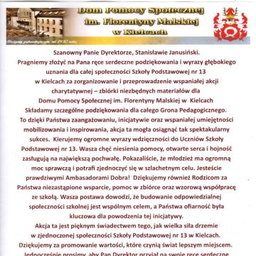 Podziękowania dla Społeczności Szkoły Podstawowej nr 13 w Kielcach