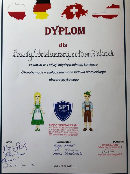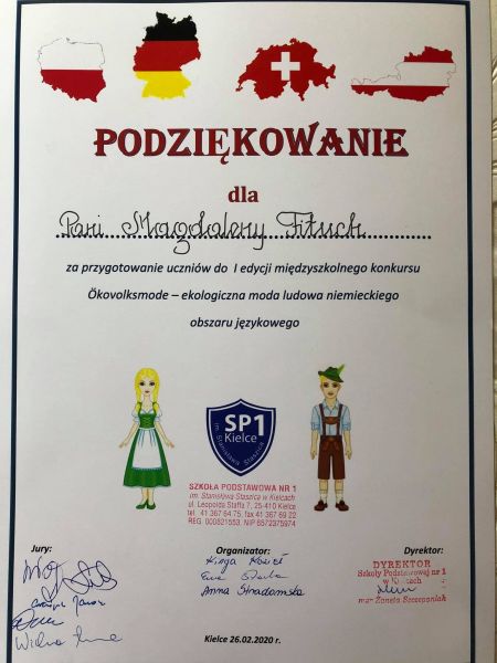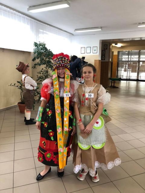 Z naszej szkoły były to uczennice z klasy 7B: Kaja Bołba i Ania Kovalenko. Dziewczynki prezentowały się zjawiskowo i zdecydowanie wyróżniały starannością oraz oryginalnością wykonanych przez siebie strojów. Kaja Bołba zdobyła ostatecznie zaszczytne II miejsce, oczarowując wszystkich doskonałym przygotowaniem językowym i przepięknym, zaprezentowanym z wdziękiem Dirndlem. Obie dziewczynki przygotowywały się solidnie już w ferie pod kierunkiem swojej nauczycielki języka niemieckiego Pani Magdaleny Fituch. Warto nadmienić, iż I miejsce zdobyła Paulina Mastalerz (SP24) przygotowana do konkursu także przez Panią M. Fituch.