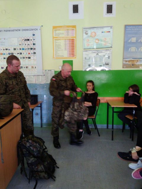 Jak zostać zawodowym żołnierzem? Jaką szkołę wybrać, aby móc kiedyś założyć mundur Wojsk Obrony Terytorialnej? Na te i podobne pytania odpowiadali goście z Wojskowej Komendy Uzupełnień i X Świętokrzyskiej Brygady Wojsk Obrony Terytorialnej podczas spotkania z uczniami klas ósmych i trzeciej gimnazjum, które odbyło się w naszej szkole 3 kwietnia br. Major Mirosław Wąchocki, kapitan Renata Mycio i szeregowy Paweł Kołda opowiedzieli, jak wygląda droga kariery zawodowego żołnierza, zaprezentowali ciekawe materiały ze szkolenia umiejętności taktycznych i strzeleckich „terytorialsów” oraz przedstawili zasady rekrutacji do służby wojskowej.