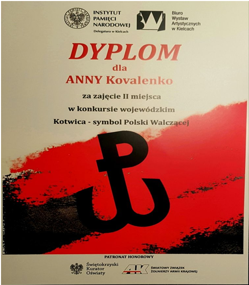 Nasza uczennica Anna Kovalenko (klasa 8 b) zdobyła II miejsce w Wojewódzkim Konkursie „Kotwica – symbol Polski Walczącej”. Ania wykonała w technice przestrzennej makietę symbolu Polski Walczącej.