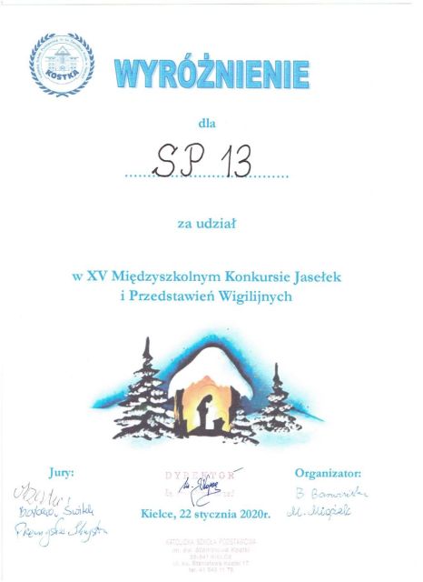 Miło nam poinformować, że nasz zespół teatralno – muzyczny zdobył wyróżnienie w XV Międzyszkolnym Konkursie Jasełek i Przedstawień Wigilijnych. Nasz uczeń – Jeremiasz Bętkowski klasa 6a został uznany za osobowość sceniczną. Jury doceniło jego wyjątkowe wykonanie pastorałki „Hej, w dzień narodzenia…”