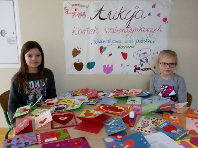 14.02.2019 r. odbyła się aukcja kartek walentynkowych pod hasłem "Walentynka dla psiaka". Dzieci ze świetlicy szkolnej zaprojektowały i wykonały kartki z wesołymi wierszykami. Dochód z ich sprzedaży zostanie przekazany na leczenie tych podopiecznych Towarzystwa Opieki nad Zwierzętami, które potrzebują weterynaryjnej pomocy.