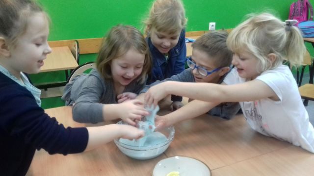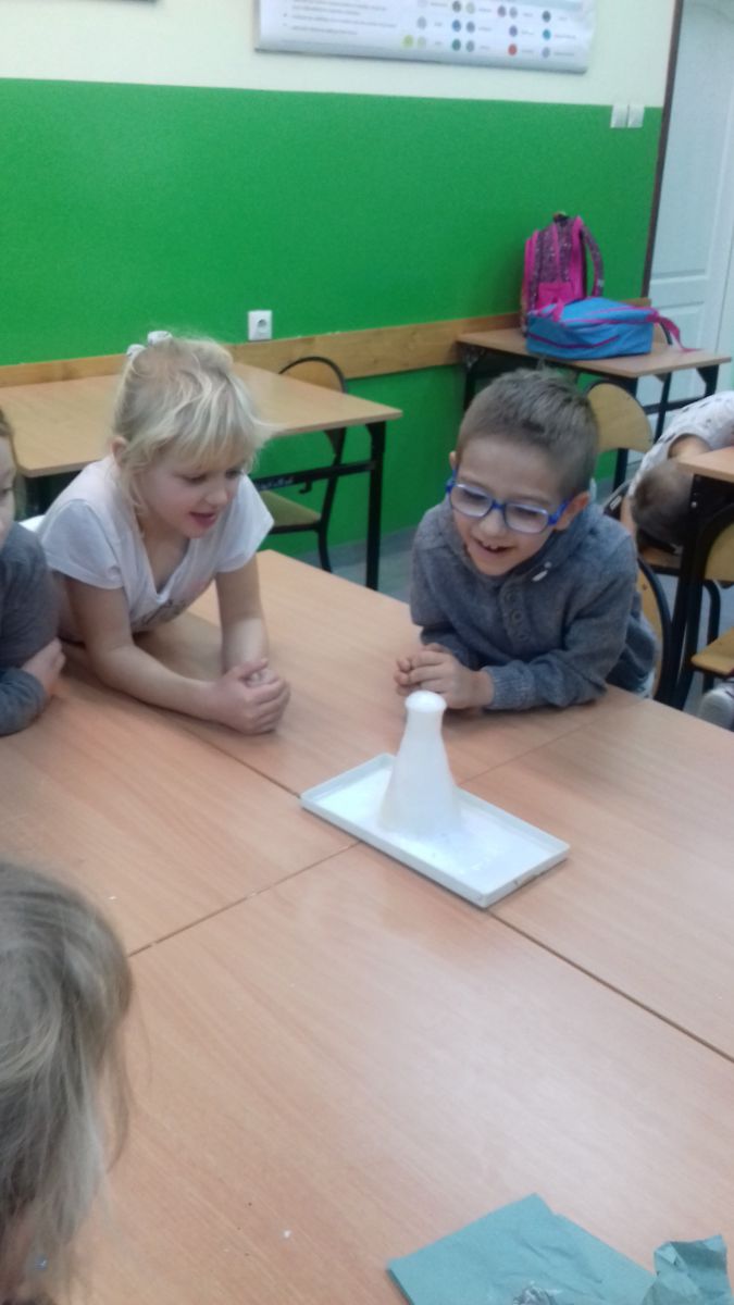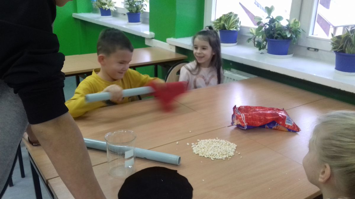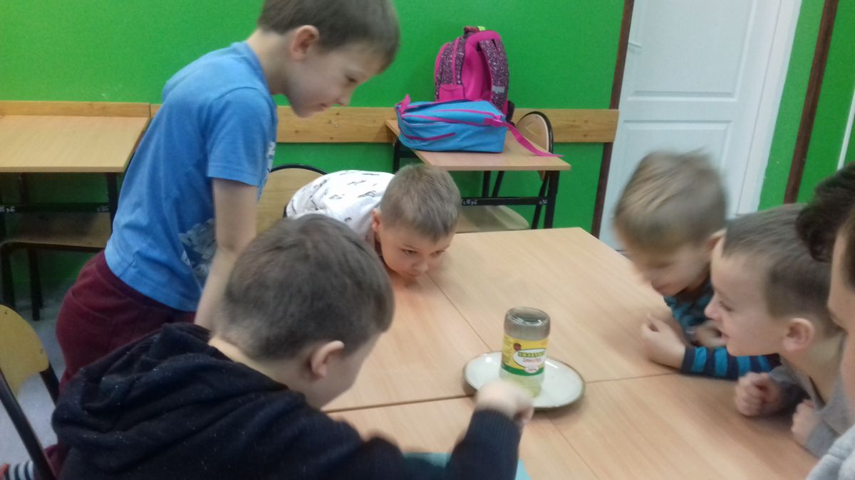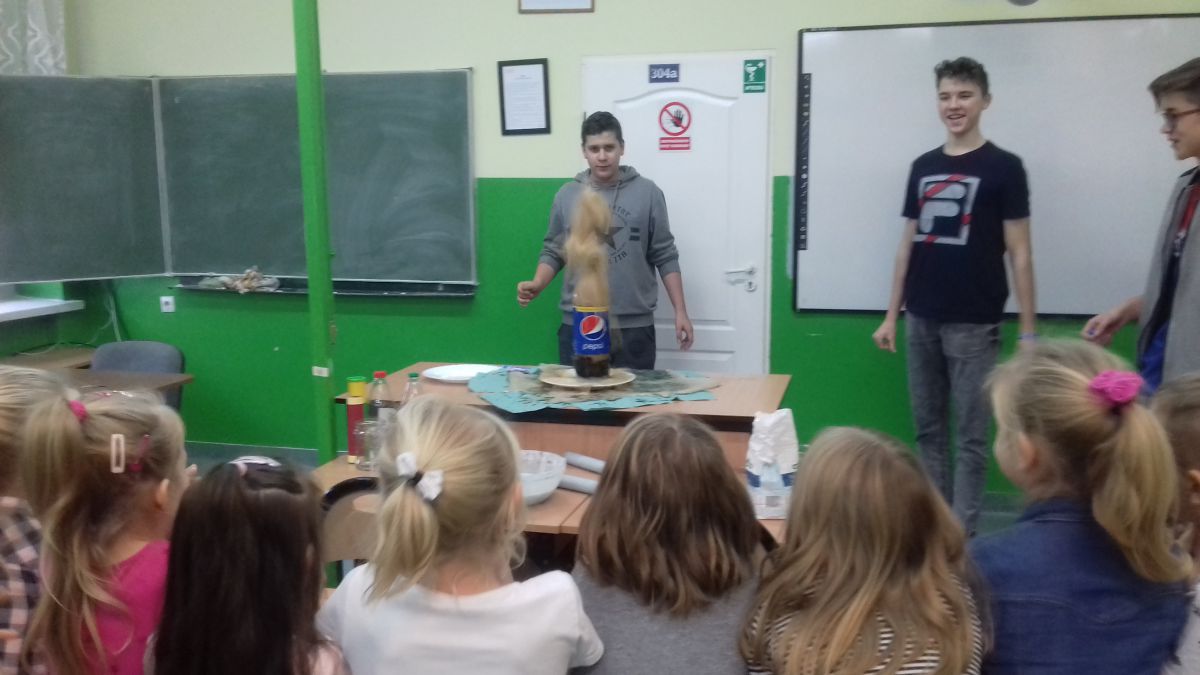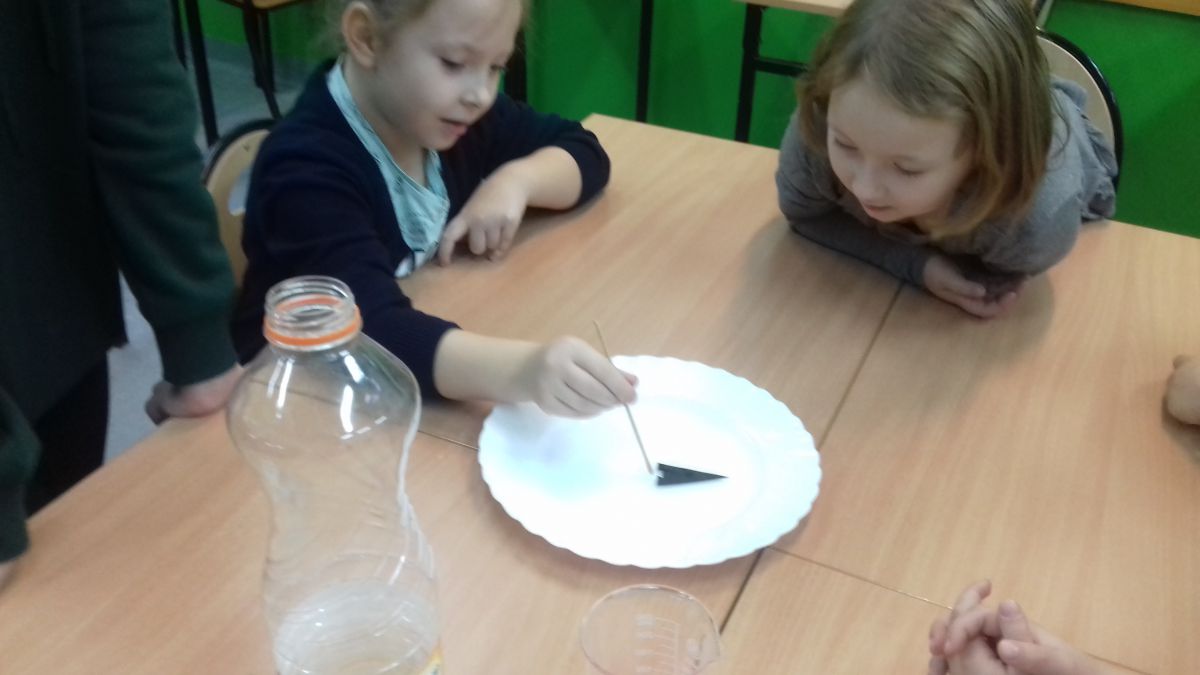 13.12.2018 r. pod czujnym okiem starszych kolegów z klasy 3A gimnazjum oraz p. Doroty Rębiś uczniowie klasy 1a przeprowadzali ciekawe doświadczenia, eksperymentowali z napięciem powierzchniowym, ciśnieniem, elektryzowaniem itp.