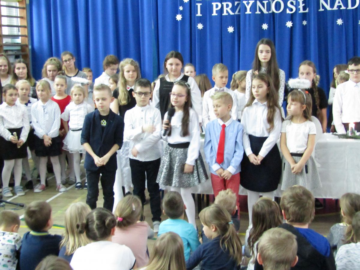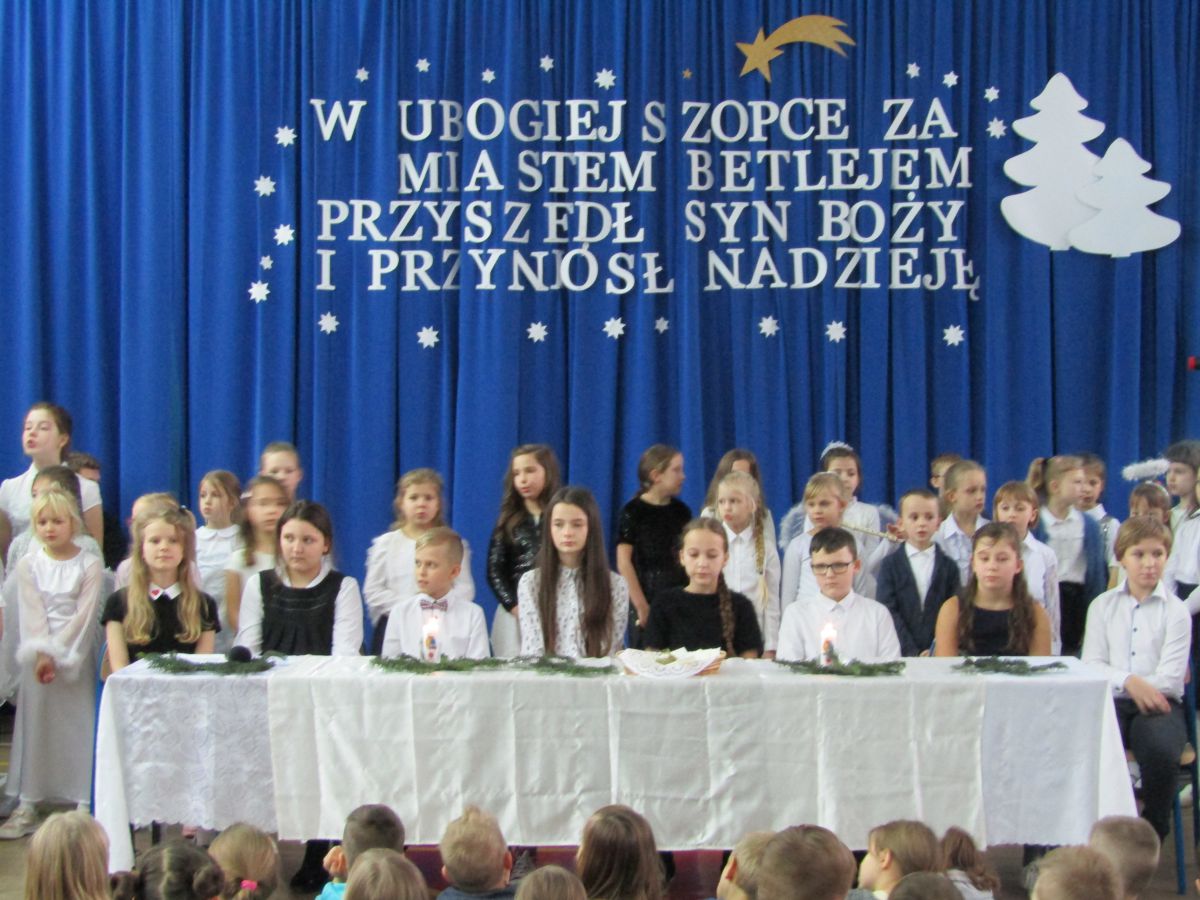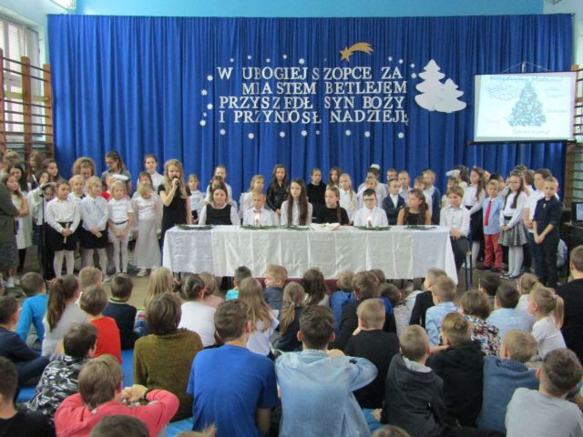 W świąteczną atmosferę wprowadzili nas uczniowie, którzy wraz z chórkiem szkolnym przygotowali przedstawienie jasełkowe. Zaprezentowali je 19 grudnia, przypominając w ten sposób wydarzenia sprzed ponad dwóch tysięcy lat, kiedy to w Betlejem narodziło się Boże Dzieciątko. Dzieci wczuły się w klimat domowej atmosfery świątecznej i przy wigilijnym stole odkrywały wspólnie sens Bożego Narodzenia. Uroku inscenizacji dodały kolędy, dzieci klas O - 3 piękną grą i śpiewem napełniły wszystkich świąteczną radością i sprawiły, że poczuliśmy radość zbliżających się świąt. Do wspólnego kolędowania włączyli się uczniowie, nauczyciele, rodzice i zaproszeni goście.