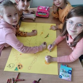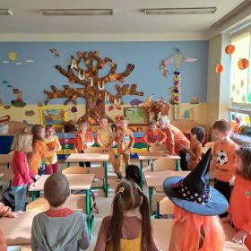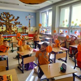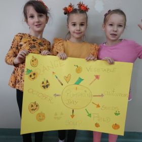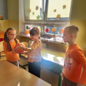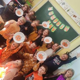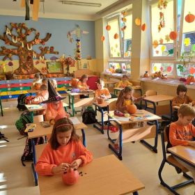 W ostatnich dniach października uczniowie naszej szkoły świętowali Pumpkin Day czyli Dzień Dyni. Z tej okazji w całej szkole zrobiło się pomarańczowo – kolor ten dominował nie tylko w ubiorze, także sale lekcyjne zostały udekorowane w klimacie dyniowo-jesiennym. Najmłodsi uczniowie podczas zajęć dowiedzieli się wielu ciekawostek na temat dyni – poznali pochodzenie tego warzywa, jego budowę, walory odżywcze a także tradycje związane z obchodami Dnia Dyni na świecie. Ponadto nie zabrakło tematycznych zabaw ruchowych, także w języku angielskim: dyniowe kółko i krzyżyk, pumpkin emotions game, pumpkin freeze game, dyniowe kręgle i inne. Uczniowie klas I-III w czasie zajęć wykonywali prace plastyczne z dynią w roli głównej, m.in. ozdabianie dyni, dynie z papieru, rysowanie dyni wg schematu (rzuty kostką). Dzieci miały też możliwość spróbowania dyniowych przekąsek - wszyscy się przekonali, że dynia to niewątpliwie królowa jesieni – piękna, smaczna i mająca różnorodne zastosowanie.