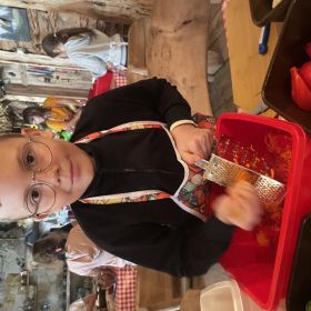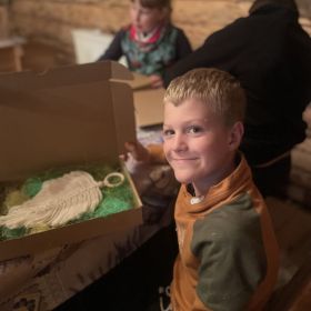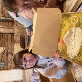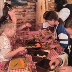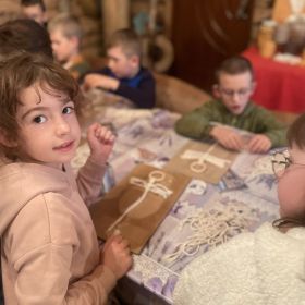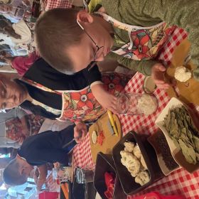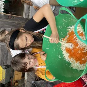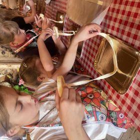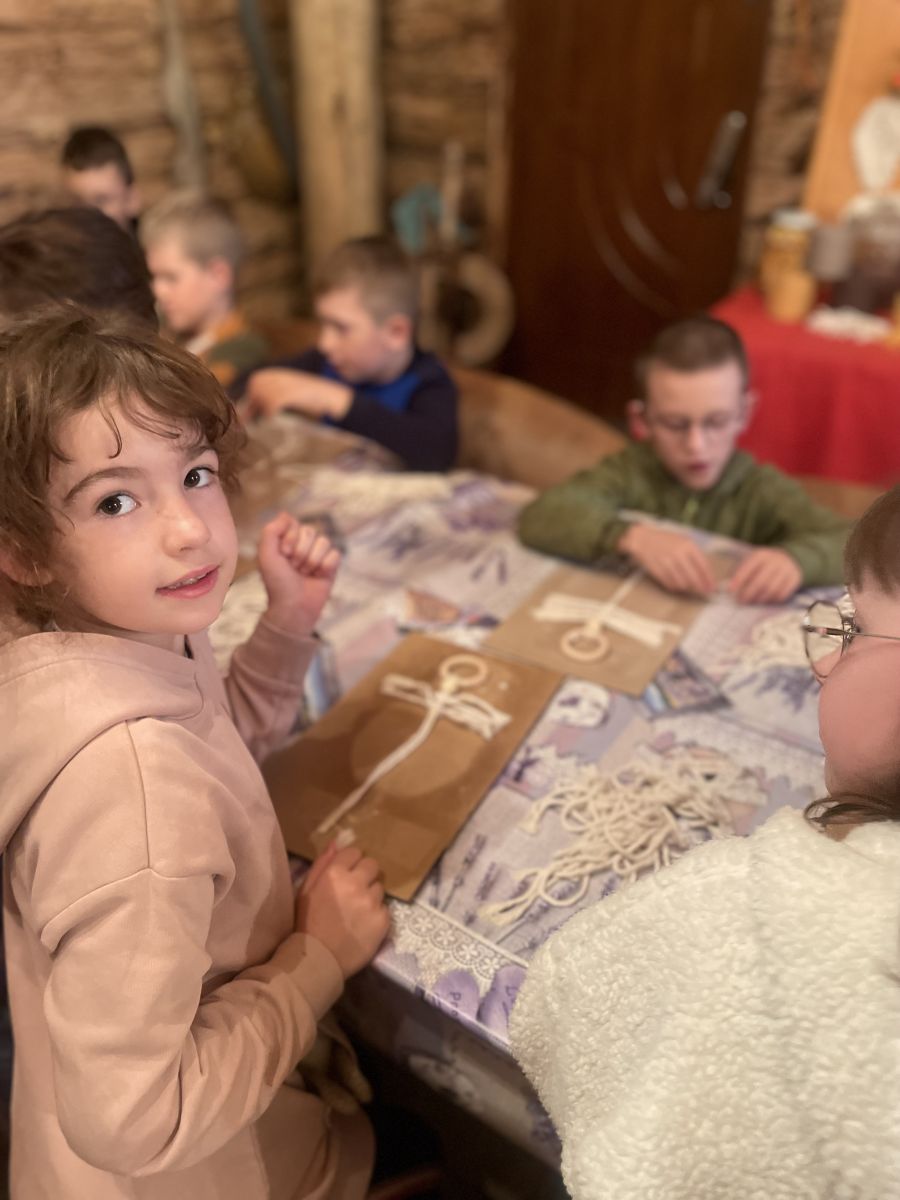 Kolejnym punktem wycieczki była wizyta w gospodarstwie agroturystycznym „Wiśniowe wzgórze” w Dębnie. Tam pod okiem Pani Beaty Antoszewskiej z LOP uczniowie poznawali tajniki konserwowania żywności i w grupach przygotowywali kiszoną kapustę – najpierw ją szatkując, a później ucierając marchew i ugniatając wszystko w misce. Następnie trzecioklasiści samodzielnie zrobili swoje kiszonki, umieszczając w słoikach wybrane warzywa i owoce. Ponadto nasi mali master szefowie z ogromną starannością i precyzją przygotowali pyszne jabłkowe krążki w cieście francuskim, a zajadając je później przyznali za smak maksymalną ocenę 10/10 punktów. Ostatnim z warsztatów były zajęcia kreatywne, w trakcie których dzieci wykonały przepiękne makramowe liście, używając do tego jedynie bawełnianych sznurków.