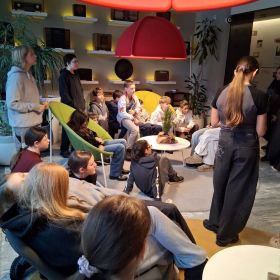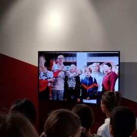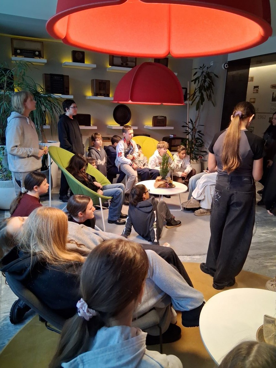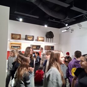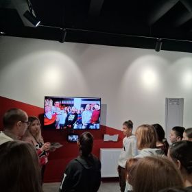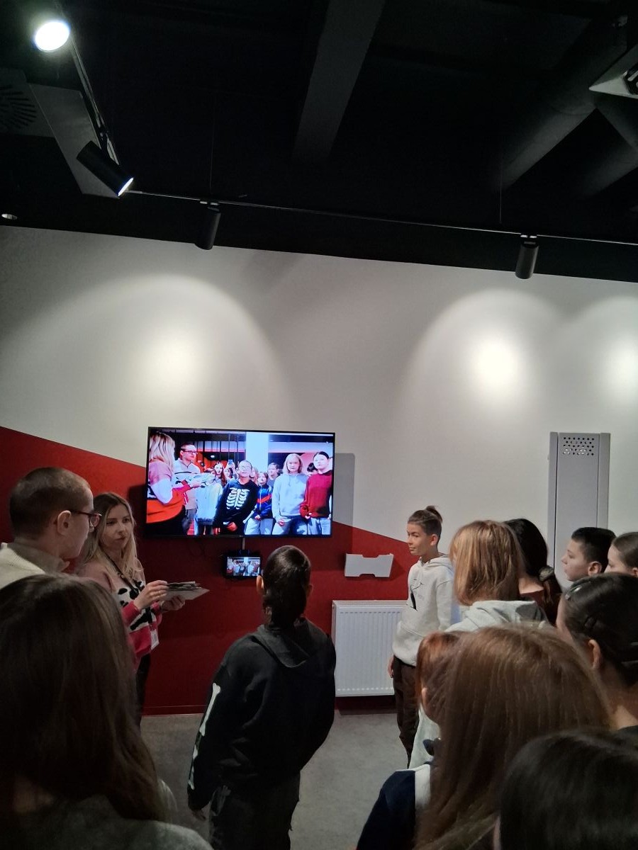 Bardzo ciekawe okazały się również atrakcje zaprezentowane w sąsiednim budynku, czyli w Centrum Edukacji Medialnej. Uczniowie poznali wiele ciekawostek z historii mediów, a także obejrzeli wystawę odbiorników radiowych i urządzeń do analogowego montażu dźwięku z różnych czasów. Mieli okazję posłuchać audycji radiowych z całego świata, a także – w specjalnym pomieszczeniu – nagrań w technologii Dolby Atmos, wykorzystywanej przez światowych filmowców czy twórców gier. Dużym zainteresowaniem cieszyły się też interaktywne zabawy z modelami 3D, a zwłaszcza ekran mgłowy, dzięki któremu możliwe było rysowanie bez ołówka. Kilkoro śmiałków poprowadziło serwis informacyjny. Na koniec uczniowie dowiedzieli się, jak rozpoznać fake newsy i manipulację w mediach. Cała wyprawa pozostawiła niezapomniane wrażenia, a wielu zainspirowała do zainteresowania się pracą radiowców. Kto wie? Może są wśród nas przyszli dziennikarze?