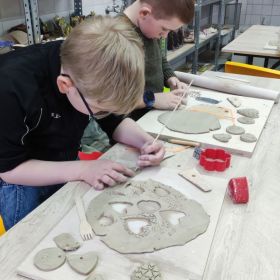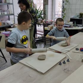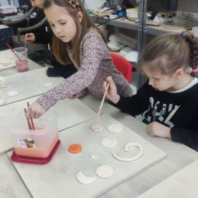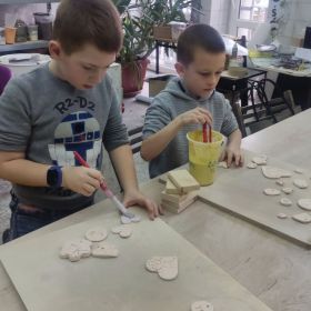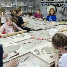 W styczniu uczniowie klasy 2b uczestniczyli w dwóch spotkaniach warsztatowych w galerii „Winda” w kieleckim KCK. Podczas pierwszych zajęć dzieci poznały właściwości gliny, oraz etapy powstawania gotowych produktów ceramicznych. Następnie przystąpiły do samodzielnego tworzenia drobnych form ceramicznych, które pozostały na miejscu do całkowitego wyschnięcia. Po tygodniu uczniowie ponownie odwiedzili pracownię i tym razem ich prace zostały poszkliwione, a później wypalone w specjalnym piecu. W końcu kolorowe medaliony, zawieszki i inne ozdoby trafiły do młodych twórców, a niektóre z nich dzieci przekazały jako podarunki dla Babć i Dziadków z okazji ich święta. Zajęcia bardzo się podobały drugoklasistom, a efekty ich pracy można zobaczyć na załączonych zdjęciach.