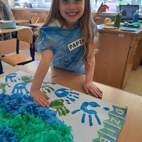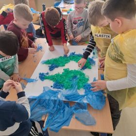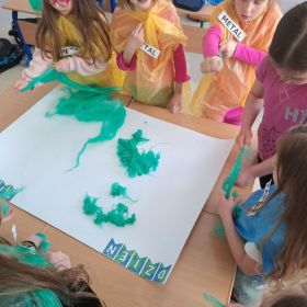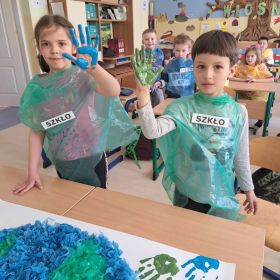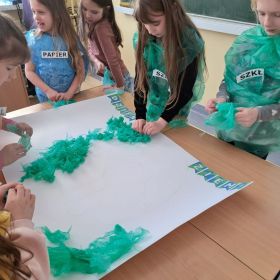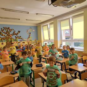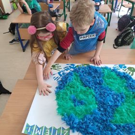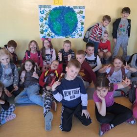 Z okazji Światowego Dnia Ziemi w naszej klasie odbyły się zajęcia poświęcone ochronie środowiska. Dzieci obejrzaly krótką prezentację dotyczącą naszej planety. Przypomnieliśmy zasady odnośnie segregacji odpadów, wymieniliśmy działania które pomagają chronić nasze środowisko. Dla utrwalenia zebranych wiadomości uczniowie wzięli udział w zabawie, w której musieli ubrać wybrany przez siebie kolor worka. Całą klasą wykonaliśmy plakat tematyczny, wyklejając Ziemię kolorową folią. Na zakończenie wybraliśmy się na poszukiwanie "Skarbów Ziemi". Tego dnia nasz planeta podarowała nam wyczekiwaną przepiękną pogodę!