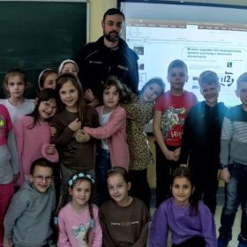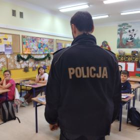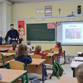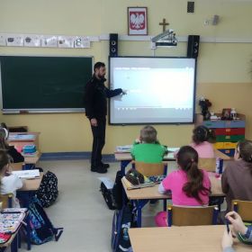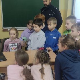 Tuż przed feriami klasy 0-3gościły na zajęciach funkcjonariusza Wydziału Ruchu Drogowego Komendy Miejskiej Policji w Kielcach Pana Tomasza Klimczewskiego. Policjant przeprowadził z uczniami pogadankę na temat bezpieczeństwa w okresie ferii zimowych a w szczególności podczas uprawiania sportów zimowych i zabaw na świeżym powietrzu. Pan Tomasz przypomniał w formie ciekawych filmów edukacyjnych o przykrych skutkach wchodzenia na kruchy lód, zjeżdżania na sankach w pobliżu jezdni, organizowania kuligu za samochodem oraz nieprzestrzegania zasad na stokach narciarskich. Na koniec zajęć każdy uczeń otrzymał „policyjną odznakę”. Serdecznie dziękujemy Panu Tomaszowi za możliwość uczestnictwa w tak ciekawych a przede wszystkim, bardzo pouczających zajęciach.