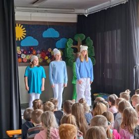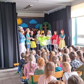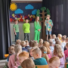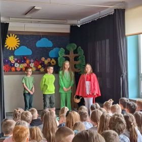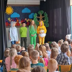 Ludzie nie zawsze właściwie dbają o naszą planetę. Dużym problemem są różne odpadki, a nie wszyscy pamiętają o segregacji i ograniczaniu ilości śmieci. Jednak wierzymy, że czym skorupka za młodu nasiąknie… Dlatego też uczniowie klasy IV b przygotowali dla swych młodszych kolegów przedstawienie, w którym baśniowi i filmowi bohaterowie uczyli ekologicznych nawyków do stosowania na co dzień. Królewna Śnieżka, Pinokio, Czerwony Kapturek, Shrek z Fioną oraz wiele innych znanych i lubianych postaci opowiadało o tym, co kryje się pod wezwaniem: „Dbaj o Ziemię – to nasz dom!” Spektakl bardzo się spodobał, co potwierdziły gromkie brawa oraz prośba o bis.