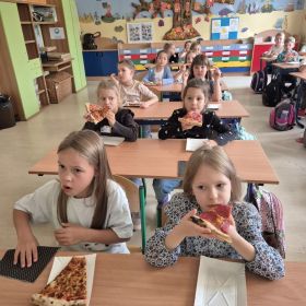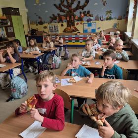 Za aktywny udział i dobrą zabawę nasi mali panowie zostali nagrodzeni dyplomami „Super Chłopaków” od wychowawcy oraz drobnymi upominkami od koleżanek z klasy. Na zakończenie usiedliśmy wszyscy do wspólnego poczęstunku, którym była ulubiona pizza.