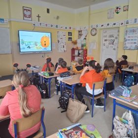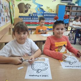 Dzieci poznały cykl rozwojowy dyni (the life cycle of a pumpkin), dowiedziały się, z czego składa się dynia (parts of a pumpkin), a także obejrzały krótką historyjkę ,,It's Pumpkin Day, Mouse!" .