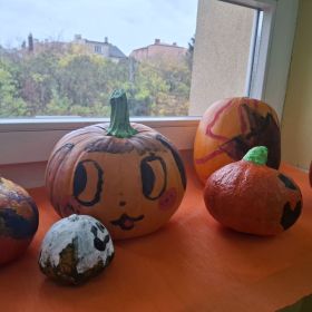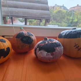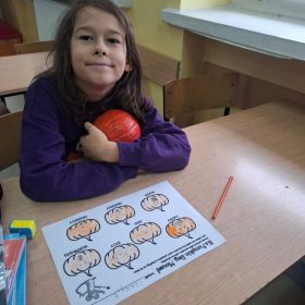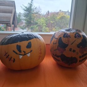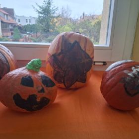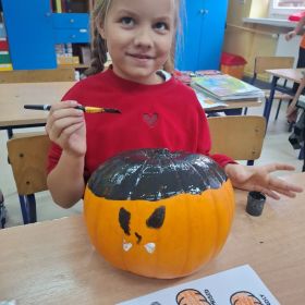Nasi mali „pumpkin experts” świetnie poradzili sobie z angielskimi nazwami i z ogromnym entuzjazmem odkrywały tajemnice tej wyjątkowej rośliny, a przyniesione i pomalowane przez dzieci dynię ozdabiają naszą salę.