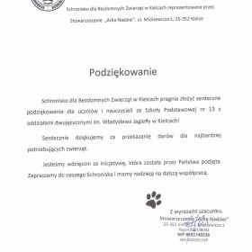 W grudniu 2023 r. przeprowadziliśmy zbiórkę karmy dla psów i kotów. Dzięki wspólnej inicjatywie Samorządu Uczniowskiego, świetlicy szkolnej i pedagogów zebraliśmy kilkanaście kilogramów karmy oraz akcesoria, które są przydatne w opiece nad zwierzętami. Zgromadzone dary podzieliliśmy - jedną część przekazaliśmy Schronisku dla Bezdomnych Zwierząt w Dyminach, a kolejną otrzymała Pani, która w naszym mieście pełni funkcję społecznego opiekuna kotów. Podjęta inicjatywa uświadomiła nam, jak ważna jest bezinteresowna pomoc oraz zwróciła uwagę na potrzeby bezdomnych zwierząt. Serdecznie dziękujemy za zaangażowanie w zbiórkę!