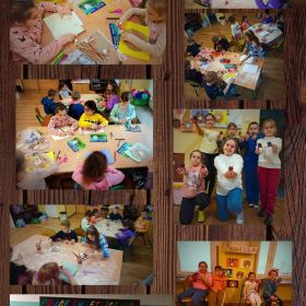 Oprócz tego radośnie obchodziliśmy Dzień Pluszowego Misia: malowaliśmy i ozdabialiśmy figurki gipsowe misiów, wykonaliśmy fotobudkę i maski, jak również trzy prace plastyczne na kartkach: miś z paseczków, talerzyków papierowych, malowany widelcem. Zwieńczeniem zabaw było wspólne malowanie 18 puzzli XXL ilustrujących Kubusia Puchatka i jego Przyjaciół oraz sklejanie ich w spójną całość.