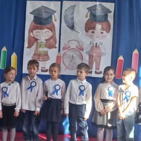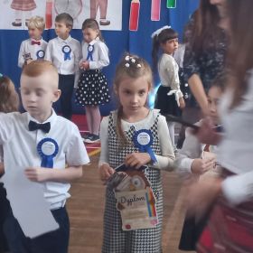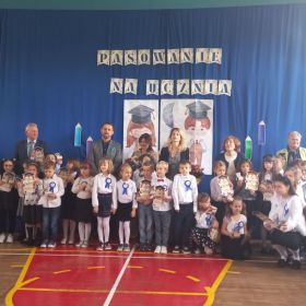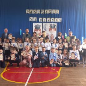 Uczniowie i uczennice klasy 1a i 1b zaprezentowali program artystyczny. Recytowane wiersze i śpiewane piosenki zostały nagrodzone gromkimi brawami przybyłych gości. Na pamiątkę tego ważnego wydarzenia dzieci otrzymały kotyliony i przyborniki.