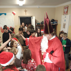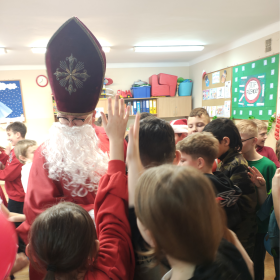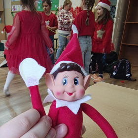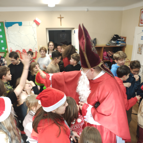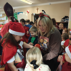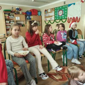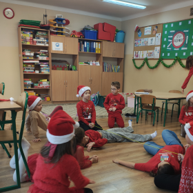 Uczniowie uczestniczyli w wielu zabawach mikołajkowych — były konkurencje ruchowe, zagadki, łamigłówki i wspólne tańce do świątecznych piosenek. Największym zaskoczeniem okazała się jednak wizyta samego Świętego Mikołaja! Przywitał dzieci dźwiękiem dzwoneczków i szerokim uśmiechem, a każde z nich otrzymało od niego słodki upominek. Po tej wyjątkowej wizycie dzieci zasiadły wygodnie do wspólnego seansu świątecznego filmu, zajadając chrupiący popcorn.