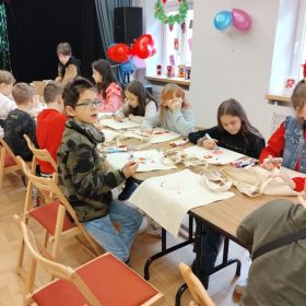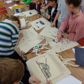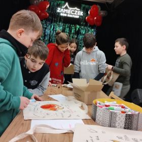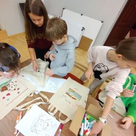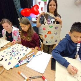 Uczniowie klas czwartych wybrali się w środę 7 lutego na warsztaty plastyczne do Domu Kultury Zameczek. Zadanie polegało na ozdobieniu toreb przy pomocy specjalnych pisaków do tkanin. Można to było zrobić według własnego projektu lub korzystając z przygotowanych szablonów. Wszyscy mocno zaangażowali się w pracę, w wyniku czego powstały prawdziwe dzieła sztuki. Z pewnością o wiele lepiej wybrać się na zakupy z taką torbą niż z foliową reklamówką. Będzie to też z pewnością wspaniała pamiątka. Tak ciekawe i angażujące zajęcia bardzo się wszystkim spodobały.