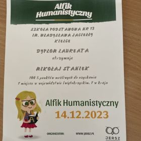 14 grudnia 2023 r. uczniowie naszej szkoły z klas 2-7 wzięli udział w konkursie Alfik Humanistyczny. Do konkursu przystąpiło łącznie 24 uczniów, z czego 14 uczniów z klas 2-3 oraz 10 uczniów z klas 4-7. Największy sukces osiągnął Mikołaj Staniek z klasy 3b zdobywając maksymalną liczbę punktów i zajmując pierwsze miejsce w kraju! Za swoje wyjątkowe osiągnięcia Mikołaj otrzymał cenną nagrodę rzeczową. Zadowalające wyniki osiągnęli również pozostali uczniowie uczestniczący w konkursie m.in. Wiktoria Garbacz z klasy 2a, zdobywając trzecie miejsce w województwie oraz Adam Rybak z klasy 4b, zajmując piąte miejsce w województwie. Jako szkoła jesteśmy dumni z osiągnięć swoich wychowanków! Składamy serdeczne gratulacje na ręce Mikołaja i pozostałych laureatów konkursu, a także ich rodziców. Życzymy dalszych sukcesów !