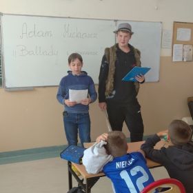 Tradycyjnie już (jak co roku) wzięliśmy udział w Narodowym Czytaniu – ogólnopolskiej akcji pod patronatem Prezydenta RP. Tym razem czytaliśmy utwory Adama Mickiewicza z tomu „Ballady i romanse”. Przyjęliśmy zasadę, że starsi czytają młodszym (ósmoklasiści prezentowali „Świteziankę” uczniom klas VI, a siódmoklasiści czytali „Powrót taty” piątoklasistom). W akcję włączyli się też uczniowie klasy IV, którzy przedstawili swoim rówieśnikom treść ballady pt. „Pani Twardowska”. Każde spotkanie poprzedzone było informacją o tym, na czym polega idea Narodowego Czytania oraz dlaczego wybrane zostały akurat te utwory. Słuchacze brawami nagrodzili lektorów, którzy bardzo starannie przygotowali się do swojej roli.