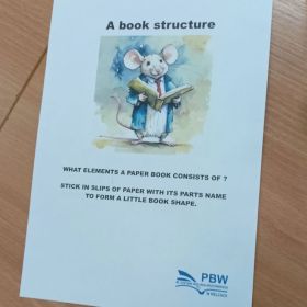 W ramach powtórki z budowy książki uczniowie mieli również możliwość stworzenia własnych mini książek. Każda z nich zawierała nazwy poszczególnych elementów książki w języku angielskim.