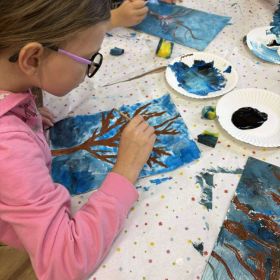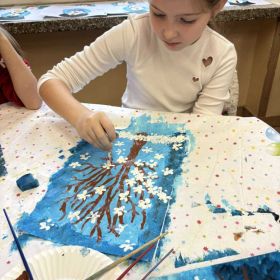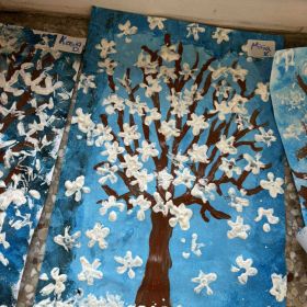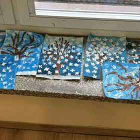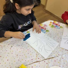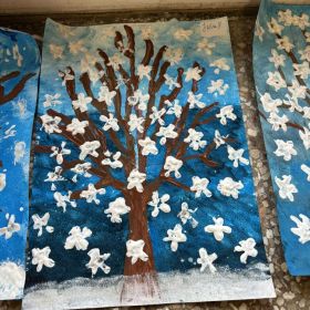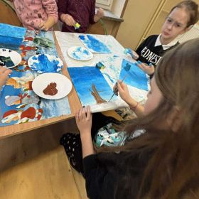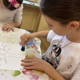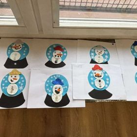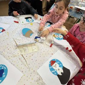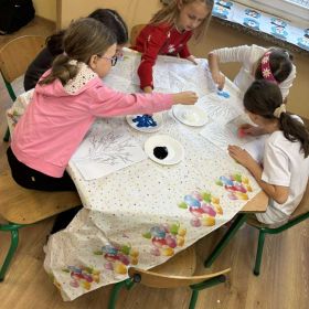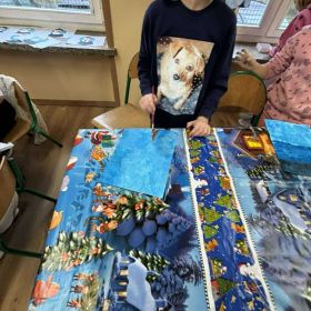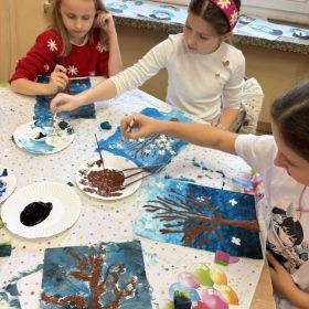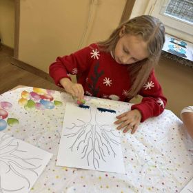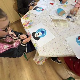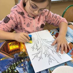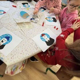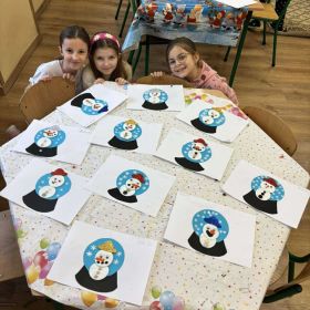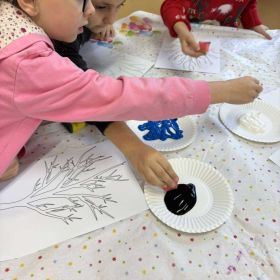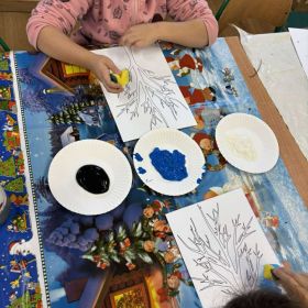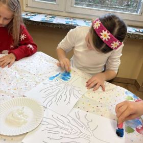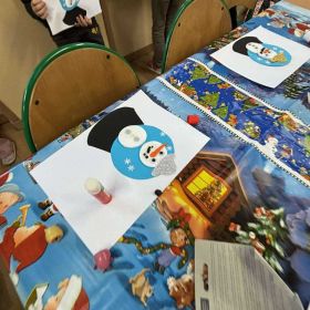 Oprócz tego wykonaliśmy zimowe prace plastyczne: bałwanki z płatków kosmetycznych i drzewka zimowe przy pomocy gąbki i papierowych słomek. Obejrzeliśmy także bajkę o Świętym Mikołaju i jego psim towarzyszu.