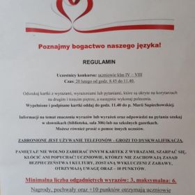 Kolejną atrakcją był konkurs pod hasłem „Poznajmy bogactwo naszego języka”. Dużym wyzwaniem było odszukanie zadań konkursowych ukrytych na II i III piętrze szkoły. Zagadki językowe, podawanie definicji wyrazów, wyjaśnianie znaczenia związków frazeologicznych oraz zadania związane ze zmianami w pisowni obowiązującymi od tego roku wymagały nie tylko wiedzy, ale także kreatywności i umiejętności wyszukiwania informacji.