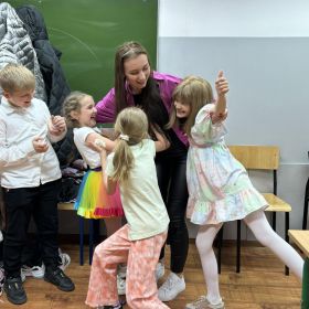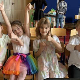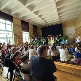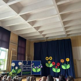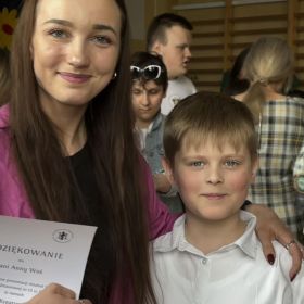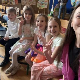 Na scenie zaprezentowali się uczniowie naszej szkoły: Wiktoria Garbacz, Polina Polishchuk, Agata Shchekovych, Szymon Hersztek. Zaśpiewali autorską piosenkę przedstawiającą tegoroczne dokonania naszej świetlicy pt. ,,Nasz Trzynastkowy Świat’’. Zarówno widownia, jak i organizatorzy byli oczarowani dynamicznym występem i nieszablonowym konceptem opartym na ułożeniu własnego tekstu do podkładu instrumentalnego popularnej ostatnio piosenki ,,Całkiem Nowa Bajka’’. Nasze zdolne Trzynastkowe Pociechy weszły na scenę z dużą dawką optymizmu i energii, porywając przy tym uczniów innych szkół do rytmicznego poruszania biodrami i ramionami oraz tupania nogą w podłogę.