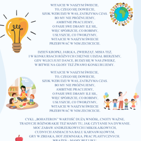 Nadszedł ten czas, kiedy wstając rankiem z łóżka słychać za oknem ptaki śpiewające o tym, że wszystko, co dobre, stało się już przeszłością i czekają na nas obowiązki szkolne. Ujrzawszy w kalendarzu dziewiąty miesiąc zaczynający się literką ,,W’’ z niezbyt wielką chęcią stawiamy czoła rzeczywistości, ale motywuje nas fakt, że robimy to dla siebie i swojej przyszłości. Pragniemy nieustająco się rozwijać i postanawiamy, iż nie zniechęci nas liczba obowiązków, pracy ani wyrzeczeń. Po takiej dawce motywacji zakładamy szkolny mundu…Chwileczkę – zaszła drobna pomyłka. Zakładamy elegancki strój i żwawym krokiem idziemy do szkoły, by przeżywać niesamowite chwile.