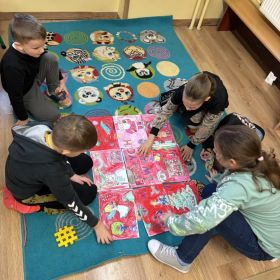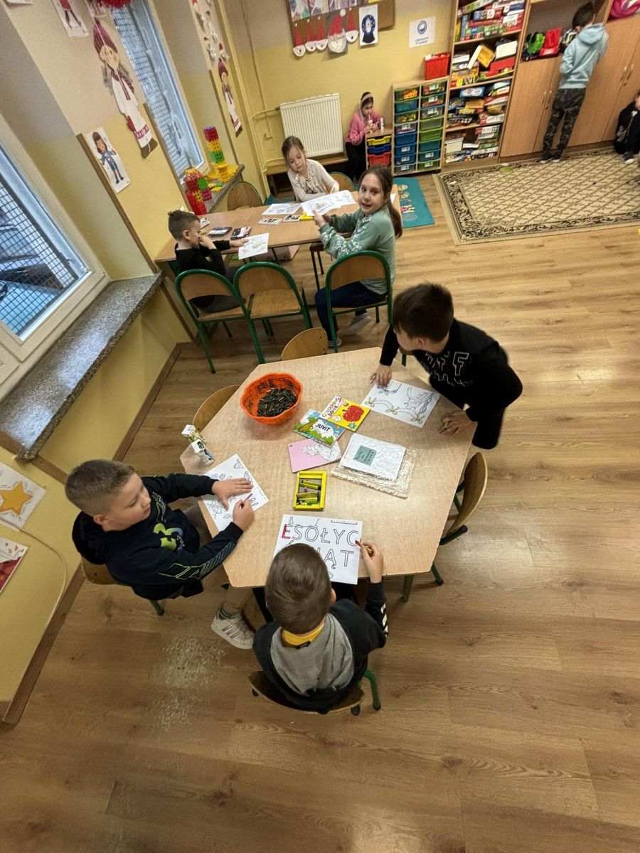 Koniec grudnia poświęciliśmy na rozmowy o świątecznych tradycjach i wymieniliśmy się refleksjami dotyczącymi tego, czym dla nas są Święta Bożego Narodzenia. Przygotowaliśmy plakat XXL, który swymi wyrazistymi kolorami ożywia naszą salę. Wykonaliśmy prace plastyczne o tematyce świątecznej metodą wydzieranki oraz kulek z bibuły. Nie zabrakło również akcentu muzycznego, dlatego zorganizowaliśmy świąteczną bitwę na głosy pomiędzy Świetliczakami a kadrą wychowawczą, którą bez cienia wątpliwości zwyciężyły dzieci 😊