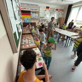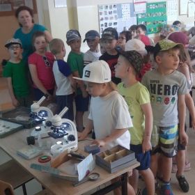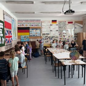 Było wesoło, gwarnie i kolorowo. We wtorek 28 maja odwiedziło nas 170 przedszkolaków z 6 kieleckich przedszkoli. W drzwiach powitał ich król Władysław Jagiełło – patron naszej placówki. W tę rolę znakomicie wcielił się uczeń klasy IV b Adam Rybak, który każde chętne dziecko pasował na królewskiego rycerza lub damę dworu. Potem nasi mali goście udali się na zwiedzanie szkoły. Mogli skorzystać z następujących atrakcji: