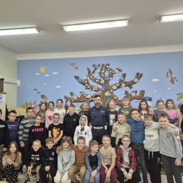 Tuz przed feriami, klasy I-III odwiedził funkcjonariusz policji, który poprowadził zajęcia dotyczące ...